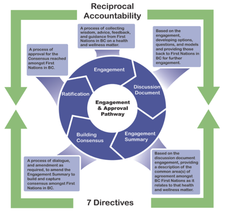 Through Resolution #2011-01, First Nations Chiefs and leaders in BC asked the FNHC to design a process for strategic decision-making in health governance. In response, the FNHC released the ‘Engagement and Approval Pathway’ – seen below – to gather their wisdom, input, and direction regarding important matters in this area. The Pathway is supported by reciprocal accountability and the 7 Directives. This crucial process continues to uphold strategic decision-making in health and the long-term goals, philosophies, and values of First Nations in BC.