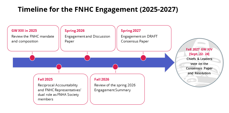 The Engagement and Approval Pathway and dialogue leading up to Gathering Wisdom for a Shared Journey XIV on September 22nd to 24th, 2027is illustrated above. As seen in the timeline figure below, during spring 2026 the FNHC-planned dialogue on ‘Evolving the FNHC’s role within the First Nations Health Governance Structure’ will center on a DRAFT Discussion Paper, which will bring results-driven focus to following key areas: